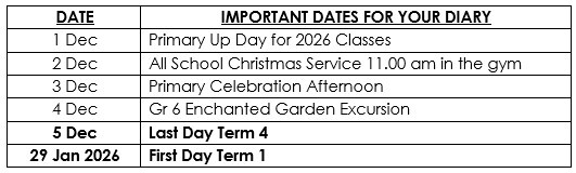 As we come to the end of another school year, it’s a wonderful time to pause and reflect on all that Term 4 has brought us. The past few months have been buzzing with energy, enthusiasm, and achievement. Our students have shown outstanding commitment—striving for academic excellence, supporting one another, and embracing every challenge with resilience and kindness. The sense of community amongst students and staff has been truly inspiring, and it’s been a privilege to witness their growth and accomplishments firsthand. Whether in the classroom, on the sports field, or during special events, everyone has contributed to making this term and year memorable. There’s a real sense of pride in how our school comes together to support each other and celebrate success. Thank you to every student, teacher, and family member for being part of this journey and making our school such a vibrant place to learn and grow.